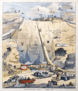 Figure 3 shows a satirical cartoon published in 1901, that warns against the future commercialization of Niagara Falls, showing it transformed into a chaotic amusement park filled with factories, gimmicky attractions, and reckless tourism.17 The exaggerated imagery---smoke-spewing industries, a roller coaster into the gorge, and a "Suicide Tank"---highlights concerns that the falls would be stripped of their natural beauty and turned into a man-made spectacle. The caption, "Save Niagara Falls---From This," reflects public fears that economic greed would destroy the landmark. The cartoon also hints at the growing competition between the United States and Canada to develop the falls for tourism and industry, foreshadowing the race to exploit the falls for hydroelectric power and commercial gain. The cartoon shaped public perception by using satire to emphasize the dangers of unchecked commercialization, warning that Niagara Falls could lose its natural grandeur to industrial and tourist exploitation. By portraying an exaggerated dystopian future filled with smoke, gimmicks, and reckless attractions, it foreshadows issues with environmental preservation and responsible development.
