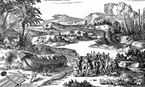 An illustration of the vessel in Father Hennepin's journal in Figure 2, shows the vessel being protected by the workers from the angered Seneca.21 It is important to note that the illustration has many discrepancies compared to the actual landscape above the Falls of Niagara. These inaccuracies are clearly shown by the palm trees that are shown in the background of the image.