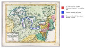 The first voyage of La Griffon began in Lake Erie and ended in Lake Michigan. This journey is shown by the blue line, below in Figure 3.25 This ambition of sailing across the Upper Great Lakes was dangerous as it had never been attempted before. As a result, La Salle and his men ran into some challenges. The first happened while sailing on Lake Erie when a thick fog settled, leaving the crew blind, but La Salle, who had seen a roughly illustrated map produced by canoe navigation years before, safely navigated them through the fog.26 By the middle of August 1679, Le Griffon sailed through both the Detroit River and Lake St Clair and into Lake Huron. While sailing through Lake Huron the crew encountered the opposition of high winds and La Salle, having less trust in his pilot, took the lead through the remainder of the journey.27 The journey on Lake Huron ended on August 27, 1679, when they reached the Bay of Michilimackinac and met up with men that La Salle had sent ahead to trade. Two of the men he had sent ahead deserted his plans, so La Salle sent Tonty out to Sault Sainte Marie to retrieve them, while he boarded La Griffon to continue through the straits to the waters of Lake Michigan. They eventually landed on Washington Island in Green Bay at the end of September 1679, with winter fast approaching. At Washington Island, La Salle and his crew met other men who were sent ahead to collect furs and wait for the arrival of La Griffon.28 The journey across three of the Upper Great Lakes and the storms that occurred reflect the dangers of French ambition on the Great Lakes and show the importance of motivation. This first voyage across the Upper Great Lakes shows the significant role that the Griffon played in fulfilling the ambitions of the French.
