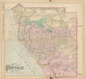 Figure 2: [Map of Buffalo, Highlighting Neighbourhood Wards, 1893] map, G.M Hopkins & Co, WardMaps LLC (1893). ↩